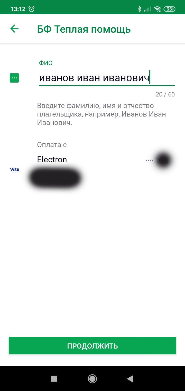 Выбрать раздел «Платежи и переводы» →«Платежи» → «Остальное» → наверху в поисковой строке ввести "Теплая помощь"(выпадет иконка "Теплой помощи" желтого цвета с подписью «Благотворительный взнос») → ввести ФИО → ввести адрес и назначение платежа "благотворительный взнос" → сделать перевод желаемой суммы